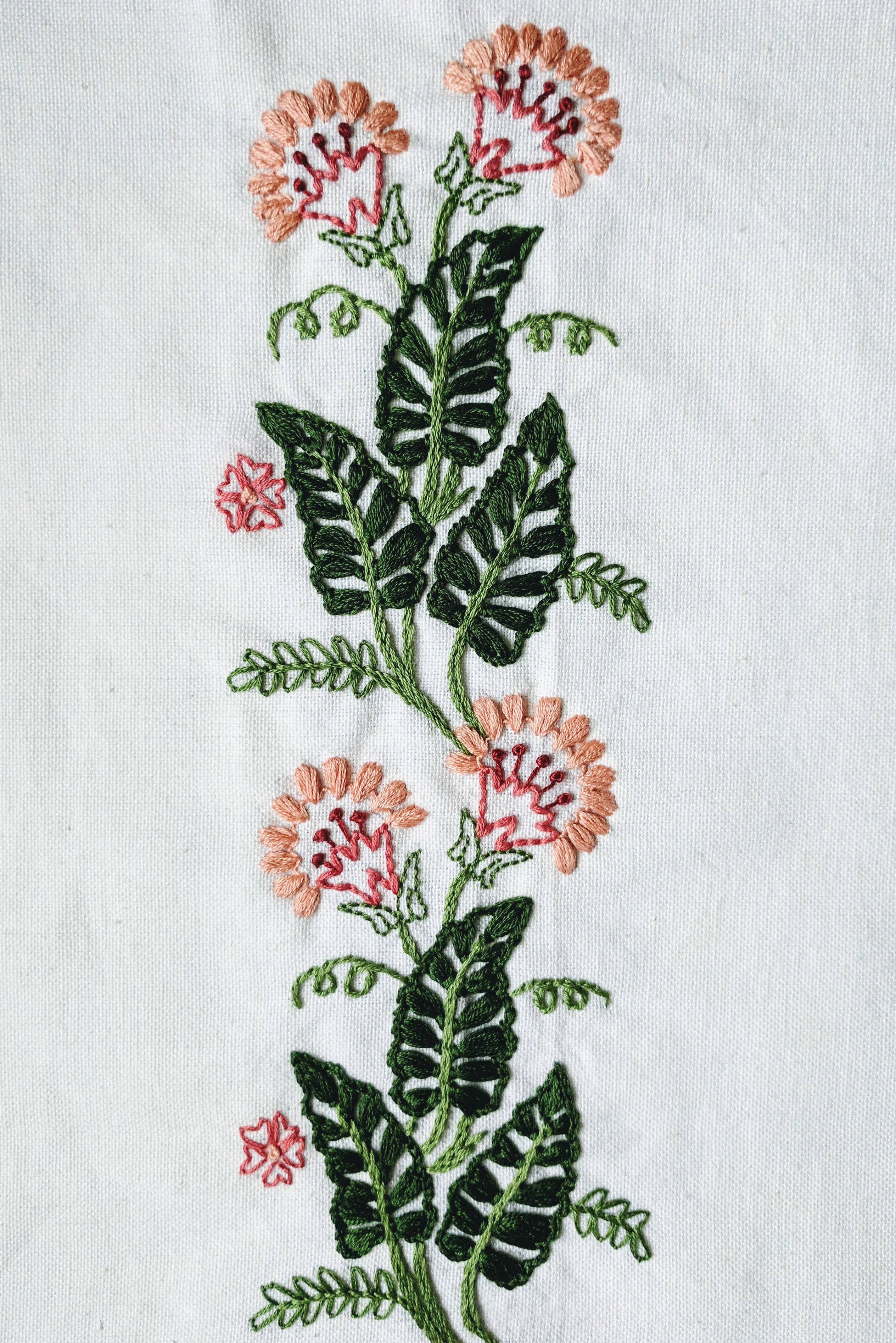 “I was analyzing fashion articles and images in an early 19th century magazine known as Ackermann’s Repository (The Repository of Arts, Literature, Commerce, Manufactures, Fashions, and Politics, published in London by Rudolph Ackermann). In some issues they included needlework patterns for readers to use, and I specifically loved the design from December 1812. Despite being over 200 years old, the designs still have a vibrant and contemporary look that feels similar to the work of many embroidery artists today, and shares many of the same botanical motifs. (It makes me so happy to think that people have been crazy about embroidering plants for generations!) So I decided to bring one of the designs from Ackermann’s to life! There are no instructions for how to actually execute the design, but presumably the idea was that readers of the magazine could use this as a starting point and pick their favorite materials, colors, and objects to embroider. Could be done as a border on a dress or a decorative piece. Mine is a border on a tea towel!”